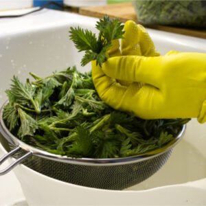 • With gloves on, rinse nettles and pull leaves from the stems. Discard or compost stems.