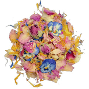 Organic Ingredients: A seasonal collection of: Cornflowers, calendula, marigold, rose petals, rosebuds, dianthus, viola, pansy, jasmine, peony, sunflower, coreopsis, pure rose oil and orange oil. (Flowers and colours will vary from season to season and batch to batch)
