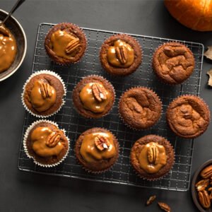 • Salted Caramel Topping – Add a pinch of salt to store-bought caramel sauce (or make your own) and spoon over cupcakes. Top with a pecan half (or nuts of choice) OR salted pepita (pumpkin seeds.) Delicious!